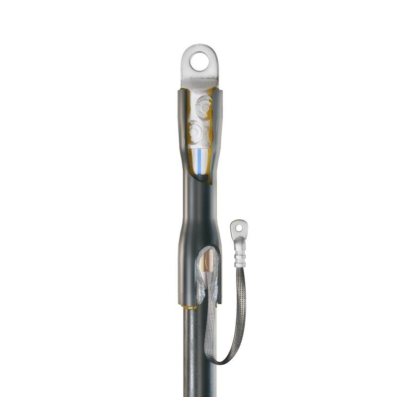 - Комплект состоит из болтового наконечника с рядным расположением болтов, термоусаживаемой манжеты с клеевым слоем на болтовой соединитель, защитного кожуха с клеевым слоем и непаяной системы заземления